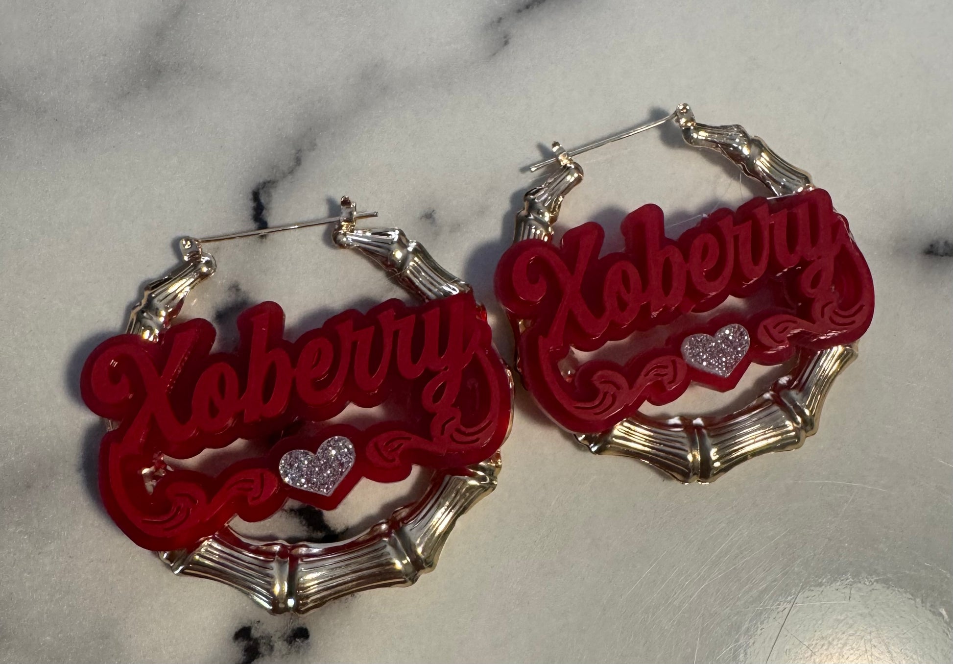 These custom bamboo earrings come in four colors, pink red blue or gold. These are a must have for your accessory collection. Include up to 10 letters order today. Medium sized -